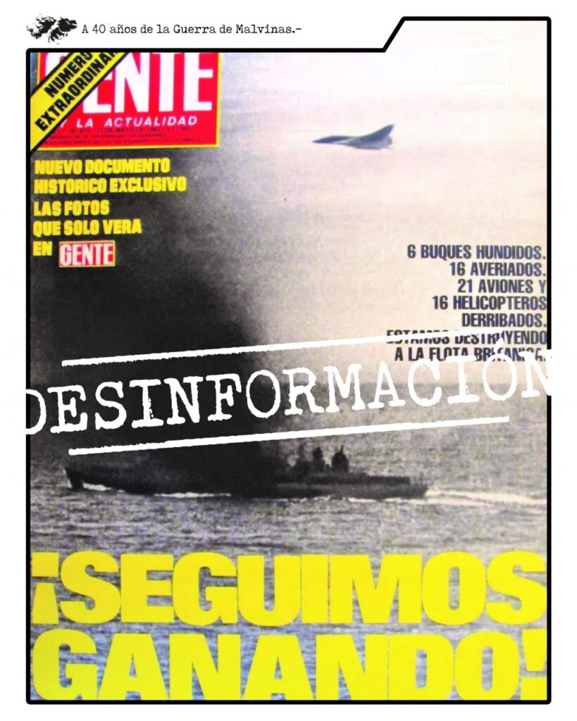 Asimismo, se comprobó la intervención deliberada de material gráfico. Jorge Gayoso, laboratorista de la editorial Atlántida, confesó años después haber intervenido una foto del destructor inglés Coventry para la tapa de Gente del 27 de mayo: “Usó una foto del destructor inglés Coventry, le agregó el avión que en la foto no estaba y creó con un truco de laboratorio el humo negro sobre la cubierta del barco”, relató. El objetivo era generar una imagen “vendedora” ante la censura militar y la escasez de material real desde el frente.