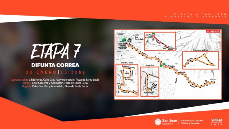 La séptima etapa de la Vuelta a San Juan 2026, originalmente la 'etapa reina' con ascenso al Alto Colorado, fue suspendida por intransitabilidad de la Ruta Nacional 40 debido a intensas lluvias y crecientes. La competencia fue reprogramada para la tarde del mismo viernes 30 de enero, manteniendo la largada en Plaza Santa Lucía y concluyendo en el mismo punto, con un recorrido de 142,7 km que incluirá metas de montaña en Cuesta de las Vacas y metas sprint en Caucete.