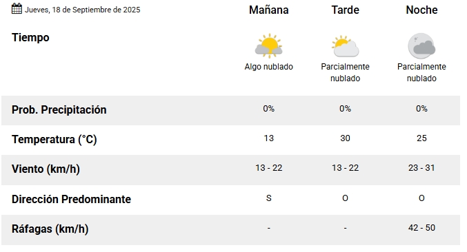 Este jueves 18 de septiembre, San Juan despierta con cielo despejado, una temperatura inicial de 13,8 °C y humedad elevada. Se espera una jornada con máxima de 30 °C, cielo parcialmente nublado durante la tarde y noche, y vientos predominantes del sector oeste. La amplitud térmica será notable, marcando el contraste entre la mañana fresca y una tarde de calor seco. No se prevén precipitaciones.