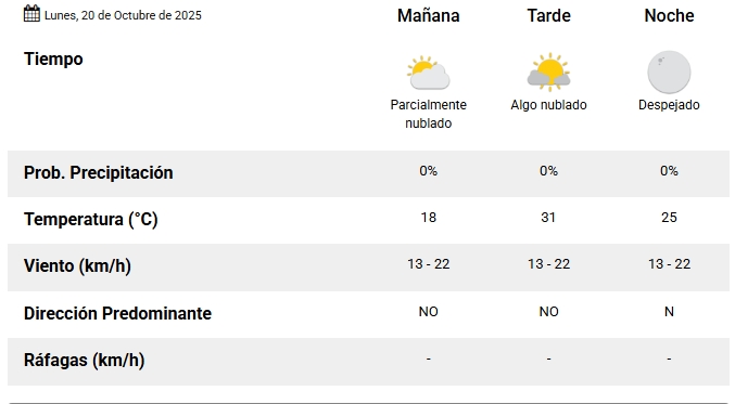 San Juan comienza la semana con temperaturas primaverales y cielo mayormente despejado. Este lunes 20 de octubre se espera una máxima de 31°C, sin probabilidad de lluvias y con vientos leves del noroeste. El clima se mantendrá cálido durante toda la jornada, y la tendencia continuará en los próximos días.